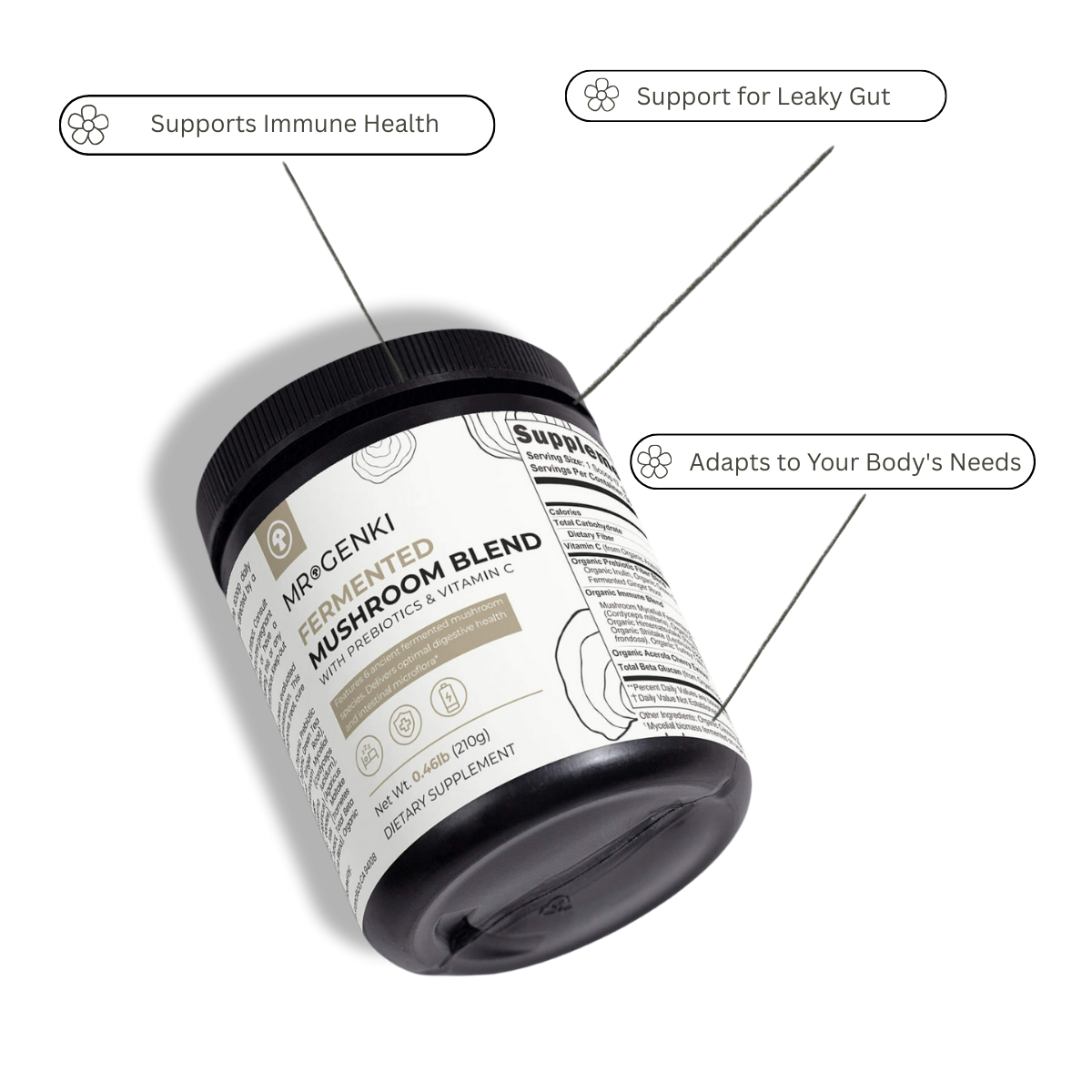 Mushroom polysaccharides + vitamin C support normal immune function and daily resilience.